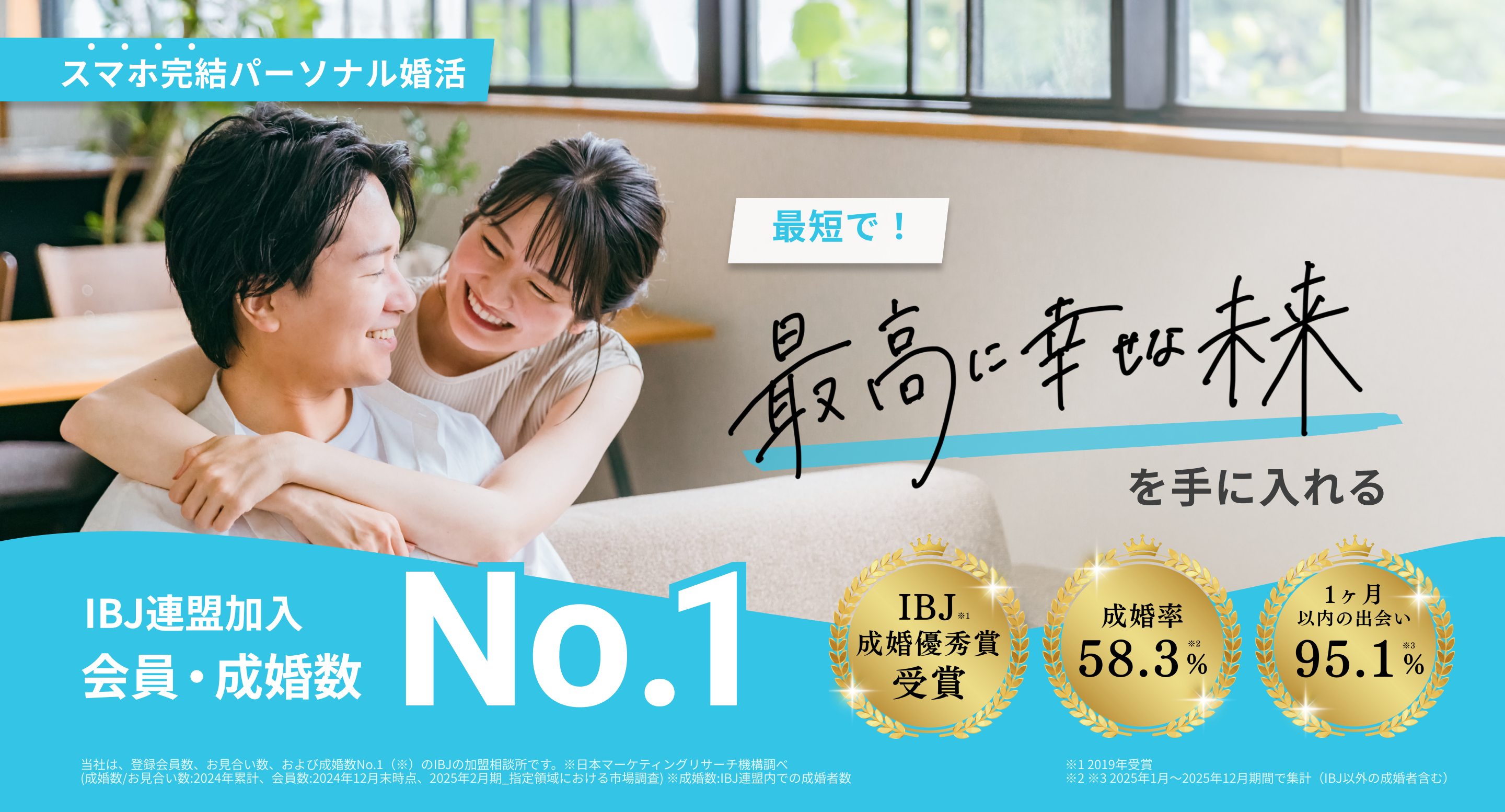 当社は、登録会員数、お見合い数、および成婚数No.1(※)のIBJの加盟相談所です。※日本マーケティングリサーチ機構調べ(成婚数/お見合い数:2024年累計、会員数:2024年12月末時点、2025年2月期指定領域における市場調査)※成婚数:IBJ連盟内での成婚者数