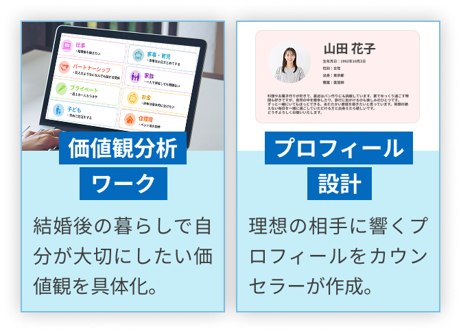 交際から成婚に向けて、すれ違いが起きないようにサポート。すり合わせるべき価値観や相談事項について整理していきます。デートが終わる毎にカウンセラーが、お相手へお気持ちを確認し、円滑に次のステップへ進めるようにアシストします。