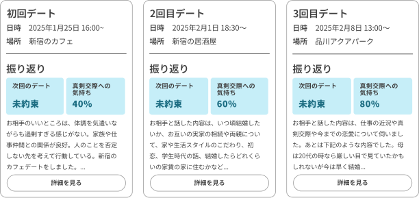 お見合いが組めるように、申し込みのコツや承諾率が上がる申し込み方法をしっかりとレクチャー。お見合い後は振り返りを行い、課題があれば解消していきます。