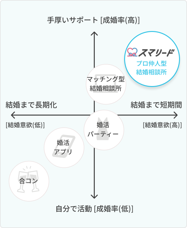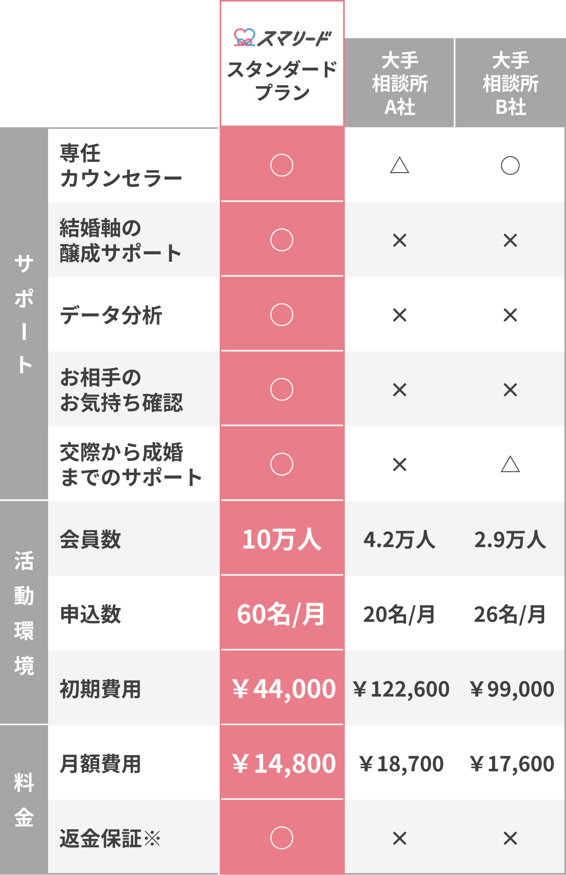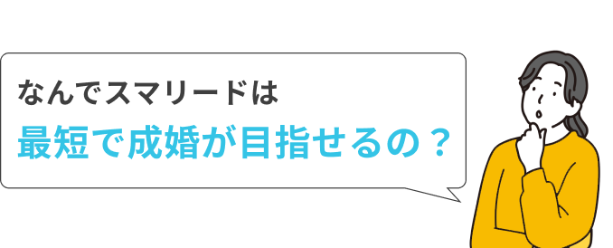 スマリードでは婚活のプロがあなたに合わせてプランニングし、短期間で成婚できるようにサポート!結婚を本気で考えている方しか登録していないため、スムーズに結婚まで活動できます。