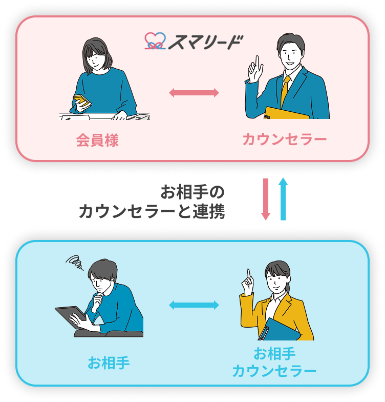 交際中のすれ違いや不安も、お相手側のカウンセラーと連携して円滑に調整。お二人の気持ちを丁寧につなぎ、安心して関係を深めていけるようにサポートいたします。
