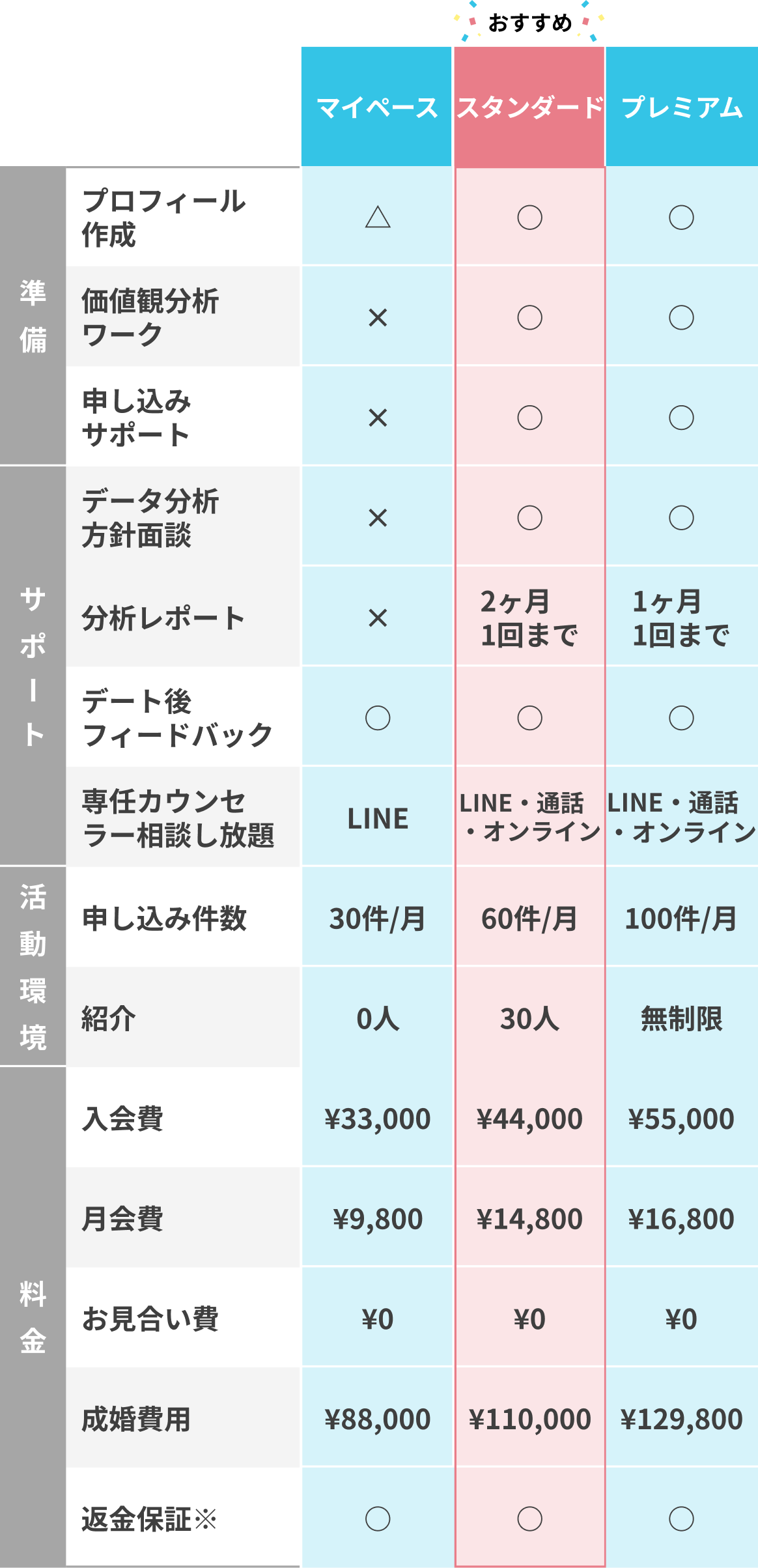 店舗にお越しいただく必要がなく、LINEやGoogle meetなどでいつでも相談できるため効率よく婚活していただけます。また、サポートプラン以上では、お客様一人一人に合わせた婚活プランニングをお作りいたしますので、自分にあった婚活が可能です。